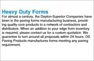 For roadway and runway construction we offer paving forms, loose dowels, loose tie bars, dowel & tie bar baskets, basket stakes, fiberglass dowel and tie bar basket systems, welded wire fabric, fabricated rebar, WWF / rebar support chairs, epoxies, cures, curing blankets, topical sealers, backer rod, hot & cold-applied joint sealants, compression seals, cast and formed aircraft tie downs, airfield & roadway safety supplies, barrier wall forming systems, saws, saw blades – early entry, wet and dry cut; drills, drill bits and drill steel and rapid set repair mortars.